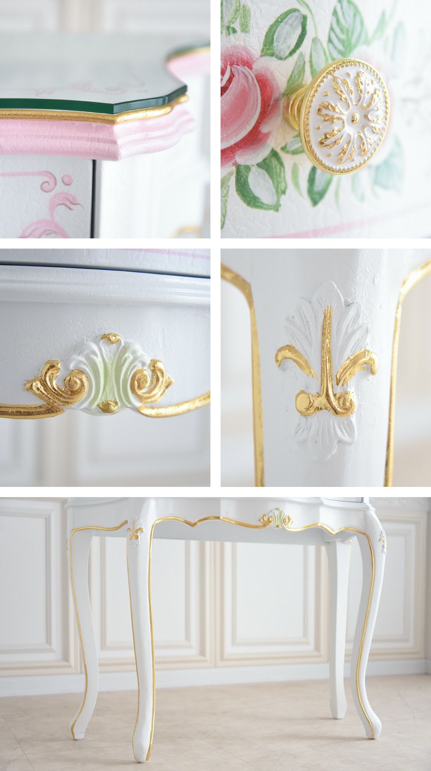 ハンドペイント、彫刻、装飾、ピンクやゴールドの色彩など、ROCOCO調にこだわりぬいて仕上げました。