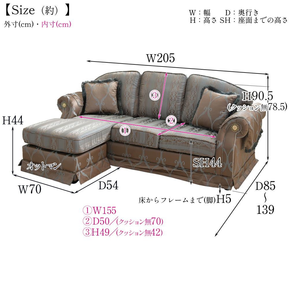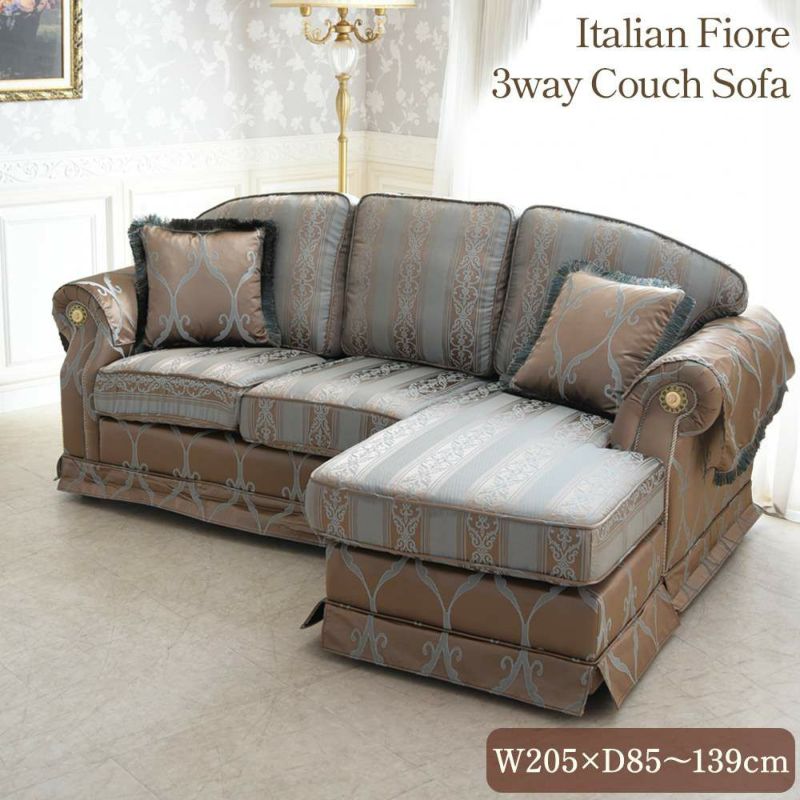 イタリアン フィオーレ 3人掛けカウチソファ 幅205cm(ゴールド)