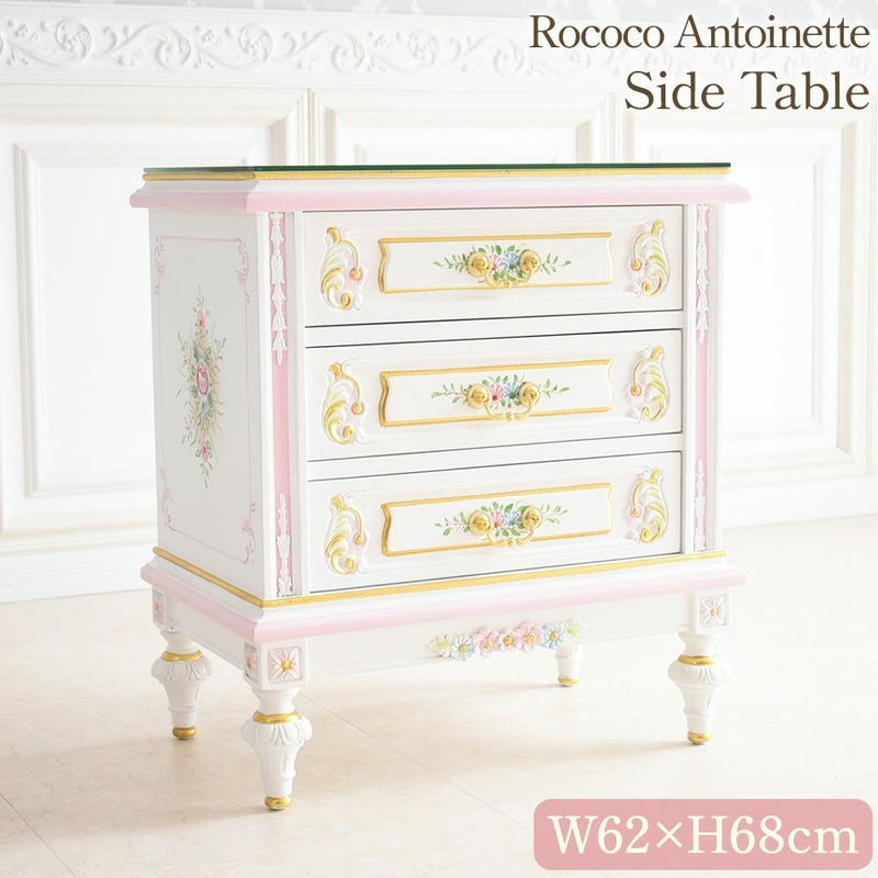 ROCOCO アントワネット 3段ナイトテーブル ガラス付 幅62cm