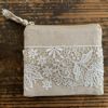 麻のような手触りの優しいポリエステル生地に艶のある真っ白なケミカルレースの草花が春のお庭を連想させる可愛いシリーズです。