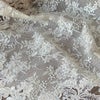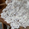 オフホワイトの上質なチュールレースに周りを細いコード刺繍の薔薇のモチーフレースをあしらい、裏側にとても淡いベージュのチュールレースを重ね合わせて、まるで、ベージュの薔薇が浮いて見えるように仕上げたとても美しい気品あるシリーズです。